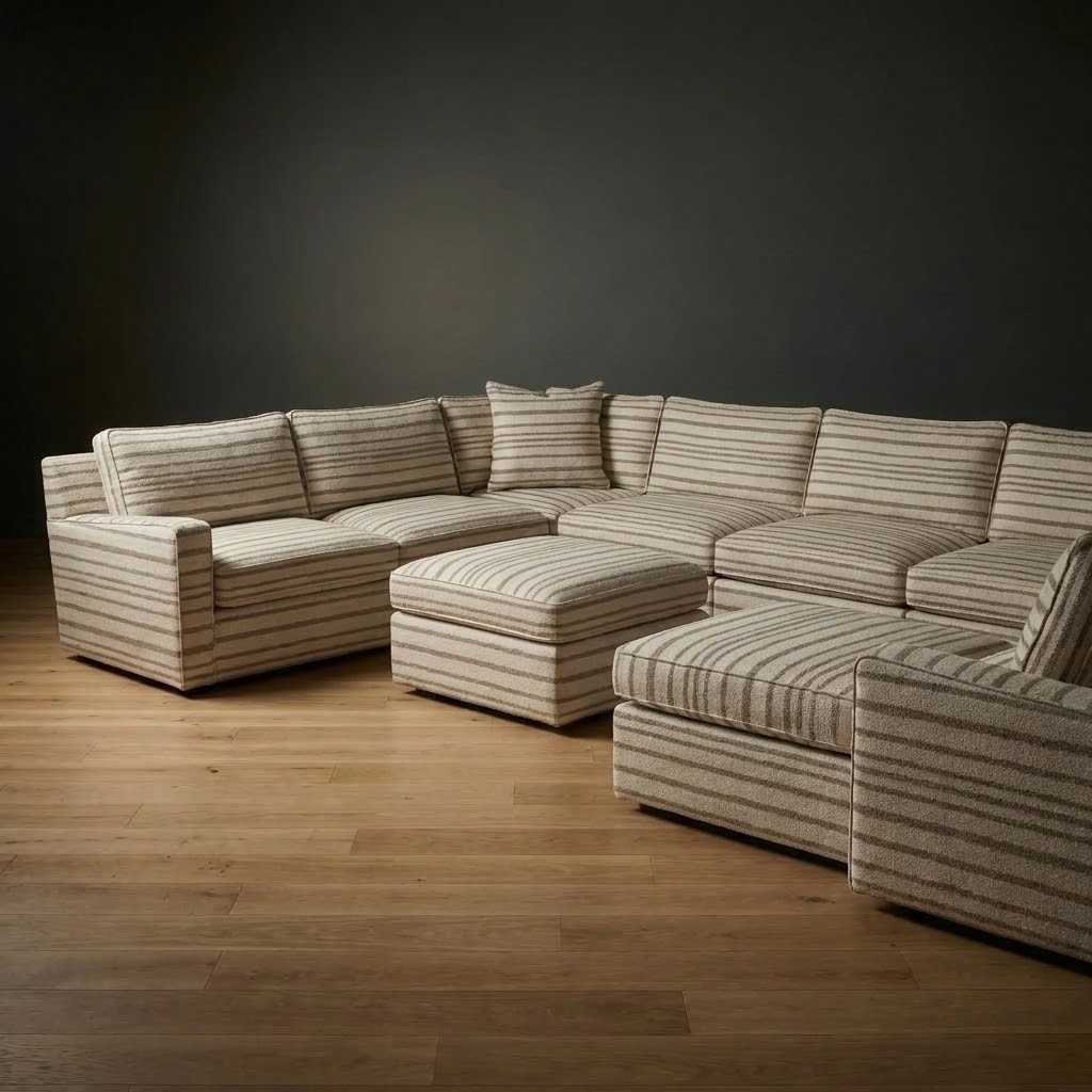 The Ellington Sectional offers generous seating in a clean, architectural frame. Deep cushions paired with structural support create a balance of style and everyday comfort. A matching ottoman works as a footrest, extra seating, or surface. Modular configuration adapts to your room and your life.