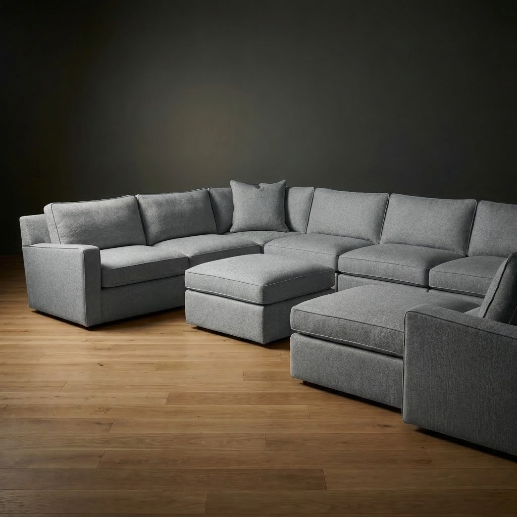 The Ellington Sectional offers generous seating in a clean, architectural frame. Deep cushions paired with structural support create a balance of style and everyday comfort. A matching ottoman works as a footrest, extra seating, or surface. Modular configuration adapts to your room and your life.
