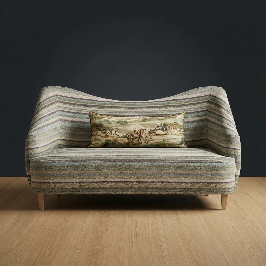 The Huntsman Settee combines refined curves with a rich, time-worn elegance. Deep olive velvet upholstery and a gently sloped back create a sophisticated yet comfortable silhouette. An equestrian-inspired lumbar pillow adds character and tradition. A statement piece for studies, sitting rooms, or entryways.