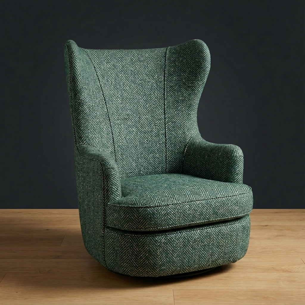 A modern interpretation of the timeless wingback. The Wayfarer Swivel Chair features an enveloping high back for supportive comfort and a smooth swivel base for effortless movement. Upholstered in top-grain leather with patterned fabric panel accents, it makes a statement in libraries, bedrooms, or living areas.
