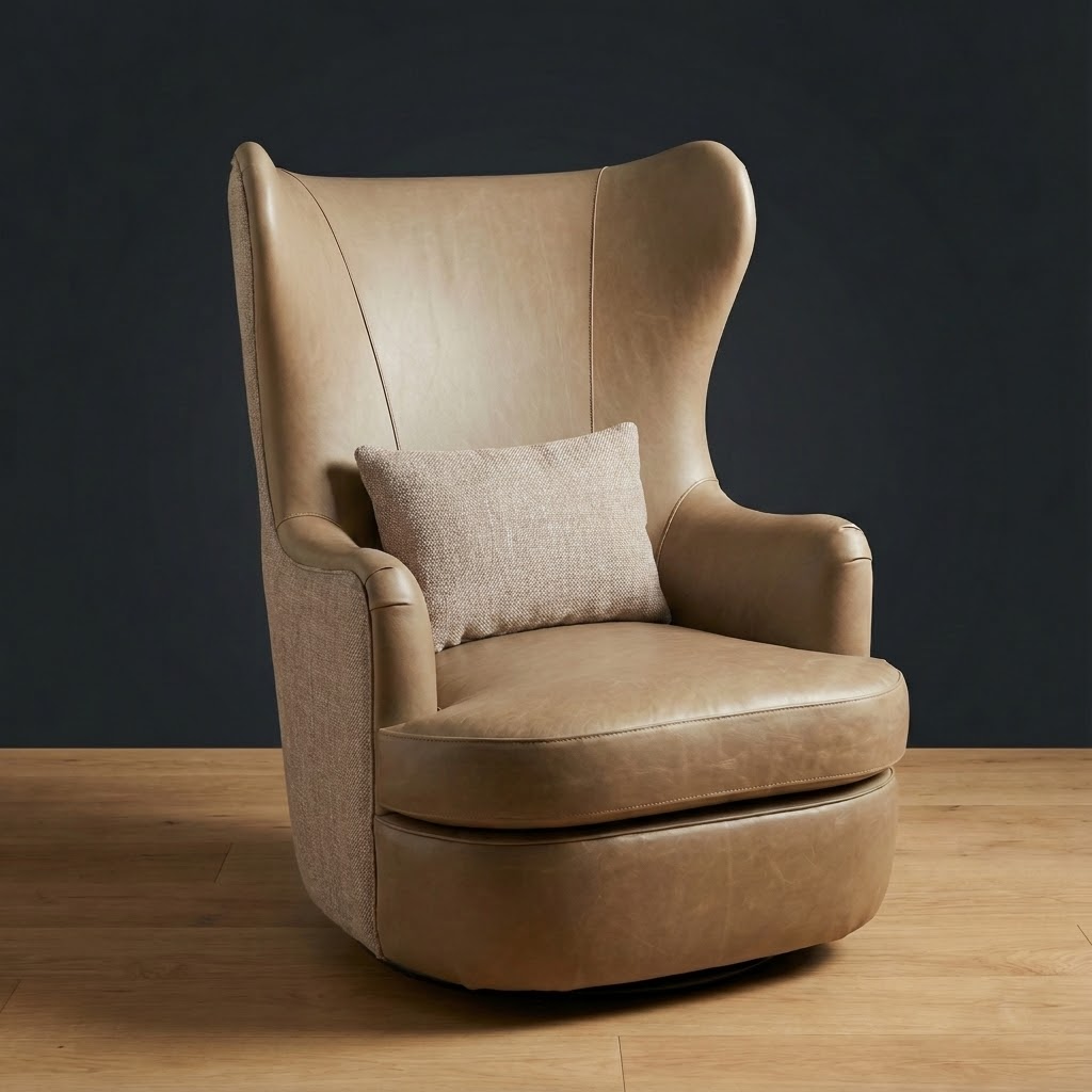 A modern interpretation of the timeless wingback. The Wayfarer Swivel Chair features an enveloping high back for supportive comfort and a smooth swivel base for effortless movement. Upholstered in top-grain leather with patterned fabric panel accents, it makes a statement in libraries, bedrooms, or living areas.