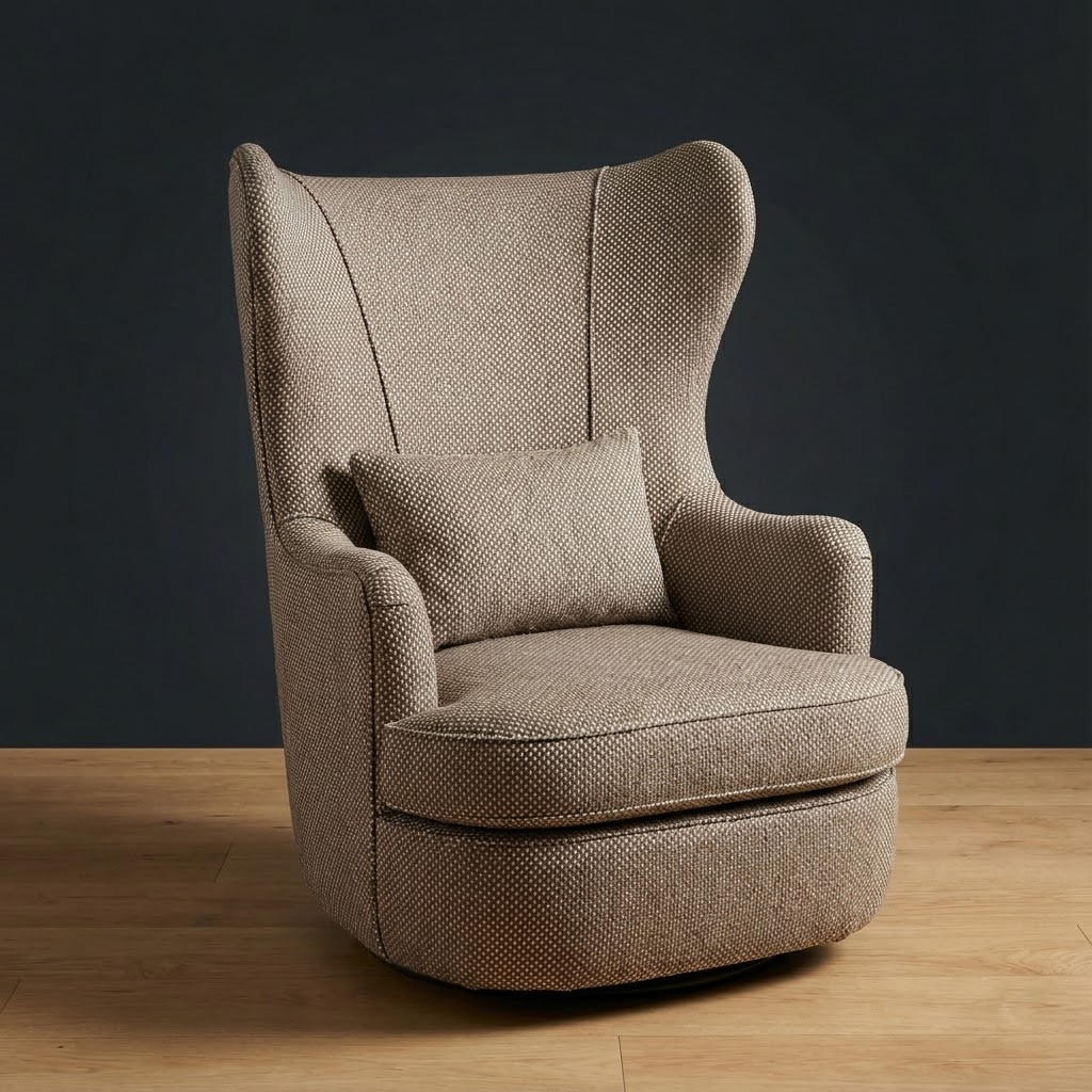 A modern interpretation of the timeless wingback. The Wayfarer Swivel Chair features an enveloping high back for supportive comfort and a smooth swivel base for effortless movement. Upholstered in top-grain leather with patterned fabric panel accents, it makes a statement in libraries, bedrooms, or living areas.