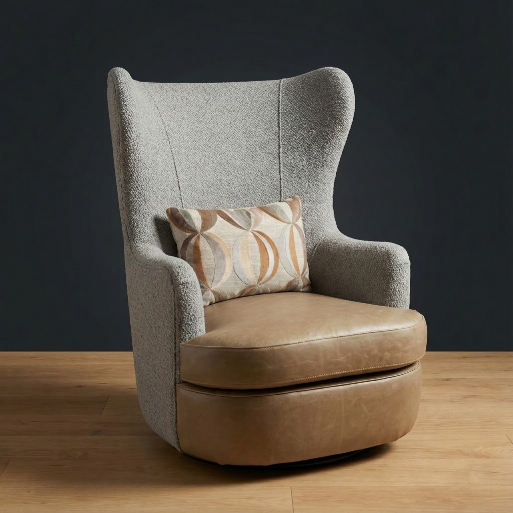 A modern interpretation of the timeless wingback. The Wayfarer Swivel Chair features an enveloping high back for supportive comfort and a smooth swivel base for effortless movement. Upholstered in top-grain leather with patterned fabric panel accents, it makes a statement in libraries, bedrooms, or living areas.