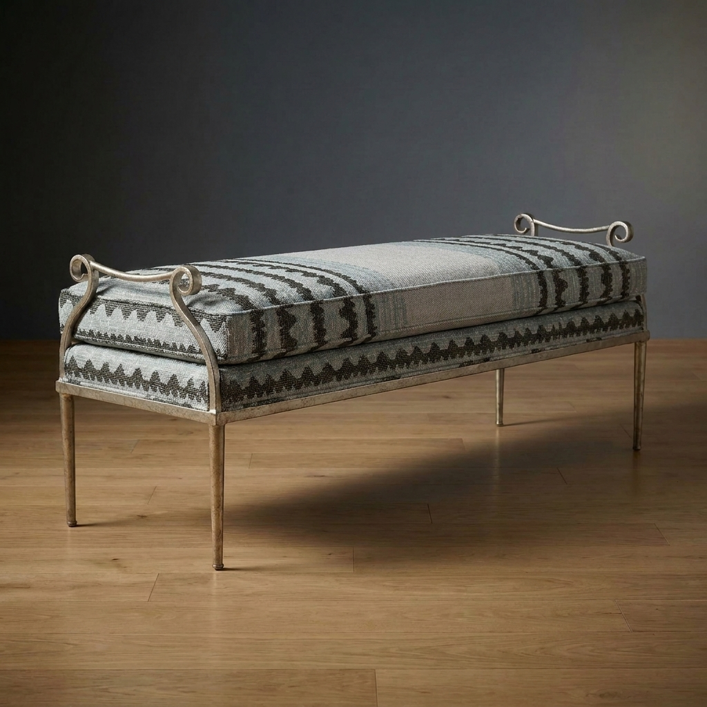Elegant and understated, the Windsor Bench blends soft comfort with subtle architectural character. A sculpted metal frame with graceful scroll details supports a tailored upholstered cushion. Classic sophistication for bedrooms, entryways, or at the foot of a dining table.