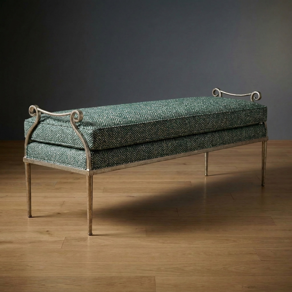 Elegant and understated, the Windsor Bench blends soft comfort with subtle architectural character. A sculpted metal frame with graceful scroll details supports a tailored upholstered cushion. Classic sophistication for bedrooms, entryways, or at the foot of a dining table.