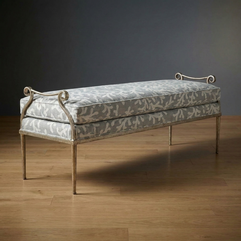 Elegant and understated, the Windsor Bench blends soft comfort with subtle architectural character. A sculpted metal frame with graceful scroll details supports a tailored upholstered cushion. Classic sophistication for bedrooms, entryways, or at the foot of a dining table.
