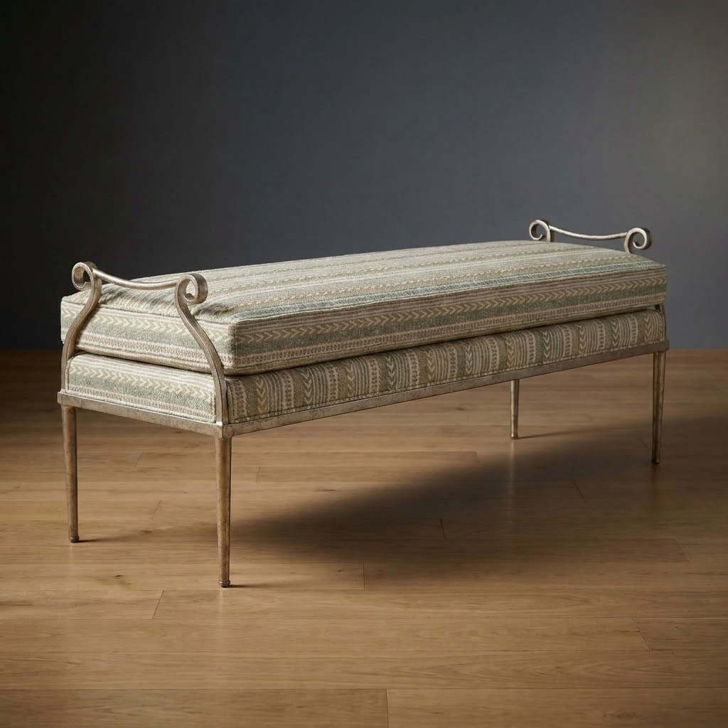 Elegant and understated, the Windsor Bench blends soft comfort with subtle architectural character. A sculpted metal frame with graceful scroll details supports a tailored upholstered cushion. Classic sophistication for bedrooms, entryways, or at the foot of a dining table.