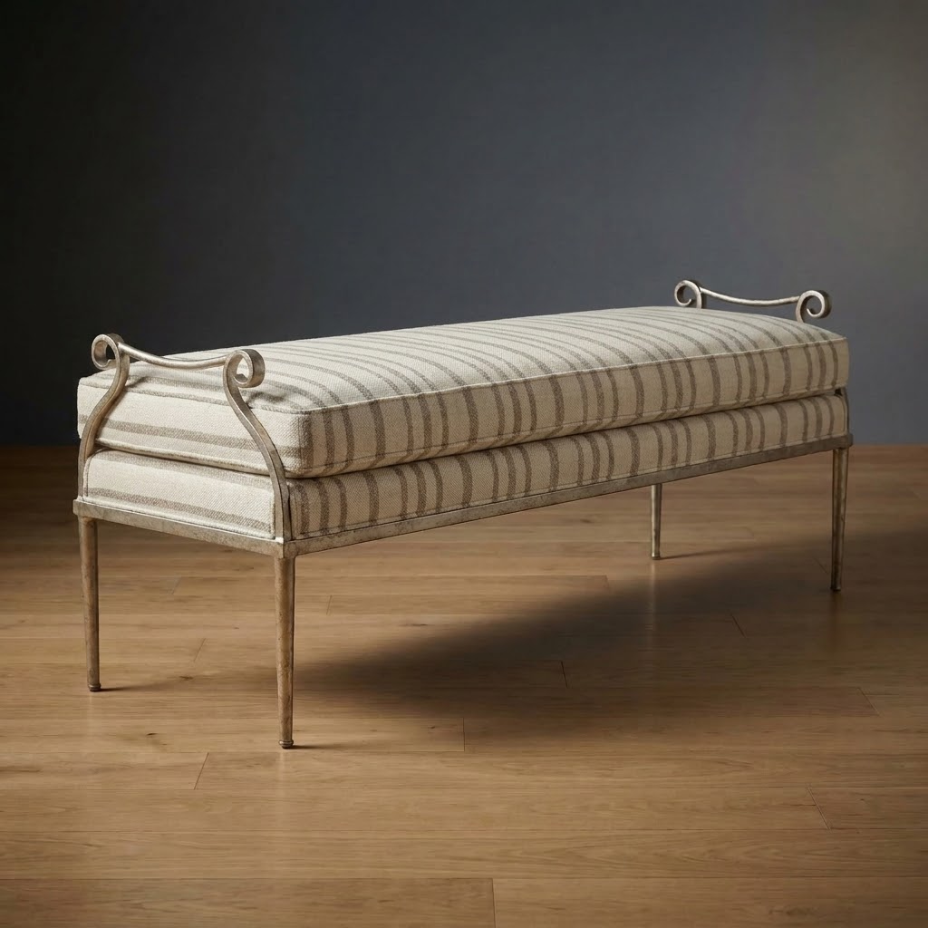 Elegant and understated, the Windsor Bench blends soft comfort with subtle architectural character. A sculpted metal frame with graceful scroll details supports a tailored upholstered cushion. Classic sophistication for bedrooms, entryways, or at the foot of a dining table.